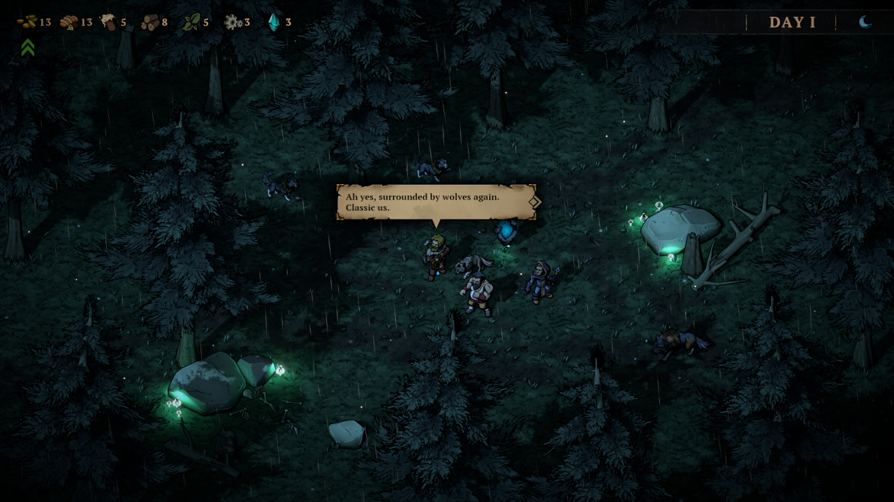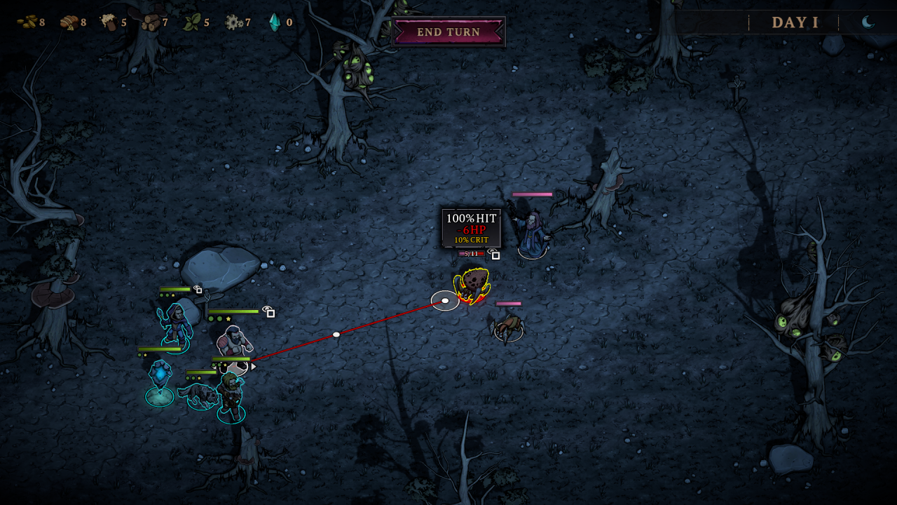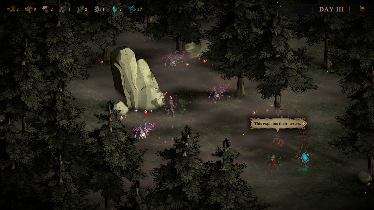Zacznijmy jednak od podstaw – bazowo dostajemy w swoje ręce trzy archetypy postaci. Mag, łotrzyk i barbarzyńca. Każdy ma swoje mocne i słabe strony, a kolejnych śmiałków musimy odblokować odnajdując ich na mapie w trakcie podróży – związani z jakimś zadaniem. Skrupulatnie dobrane trio będzie naszym oddziałem w obrębie jednego runa, który przedziera się przez pola walki, wydarzeń i obligatoryjny obóz, do którego przysiądziemy raz na kilka dni. Obóz budzi nieśmiałe skojarzenia z Darkest Dungeon, gdzie dostajemy zestaw akcji, które są dostępne, jeśli zebraliśmy odpowiednie zasoby (drewno, piwo itp. – są to nagrody po każdej walce). To tam możemy podreperować zdrowie delikwenta lub zadbać o jego formę psychiczną. Im dalej zajdziemy w naszej próbie, tym większy obłęd im grozi. Musimy dbać przede wszystkim o światło (drewno wrzucane do ogniska), które ich uspokoi.