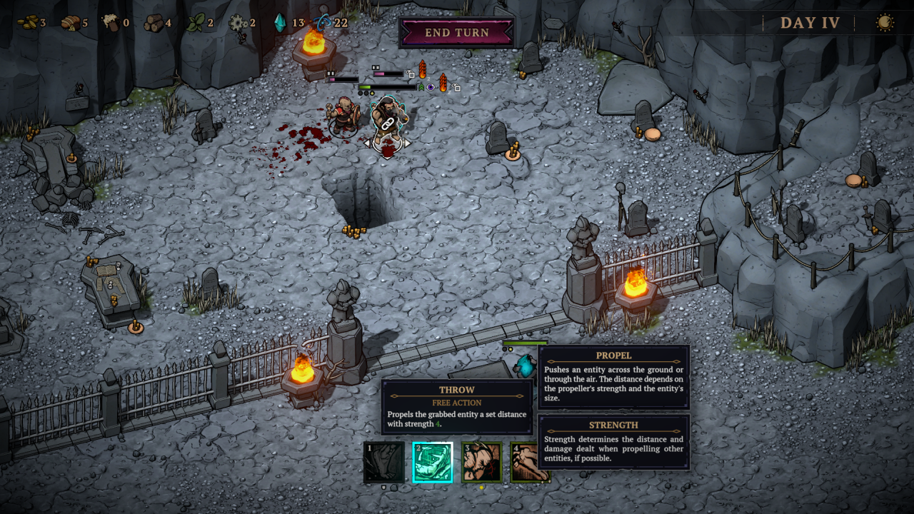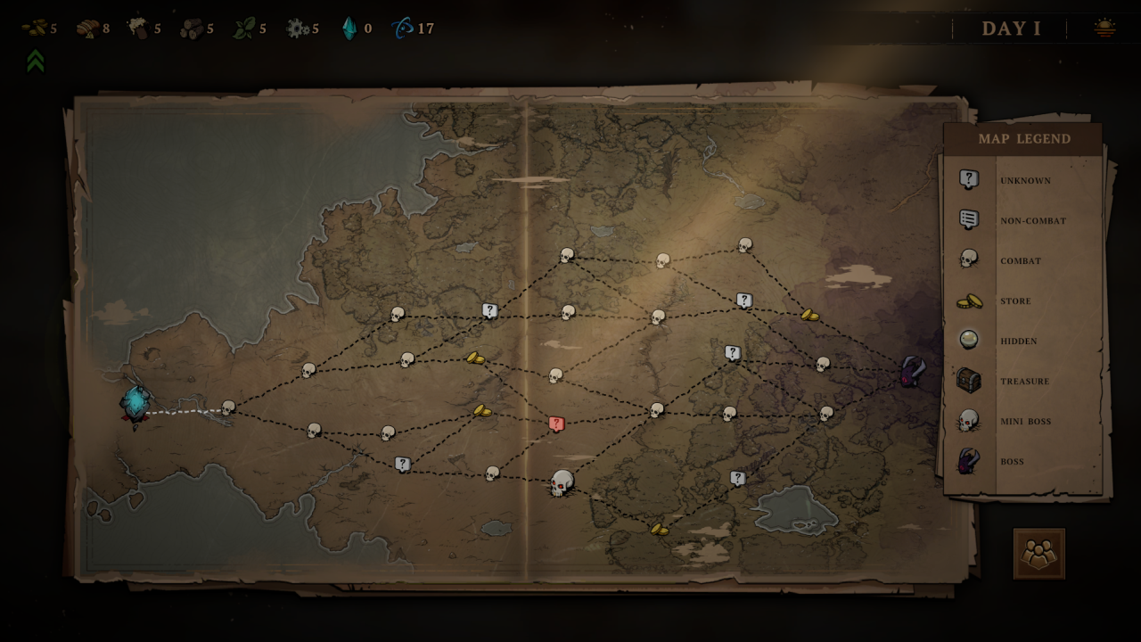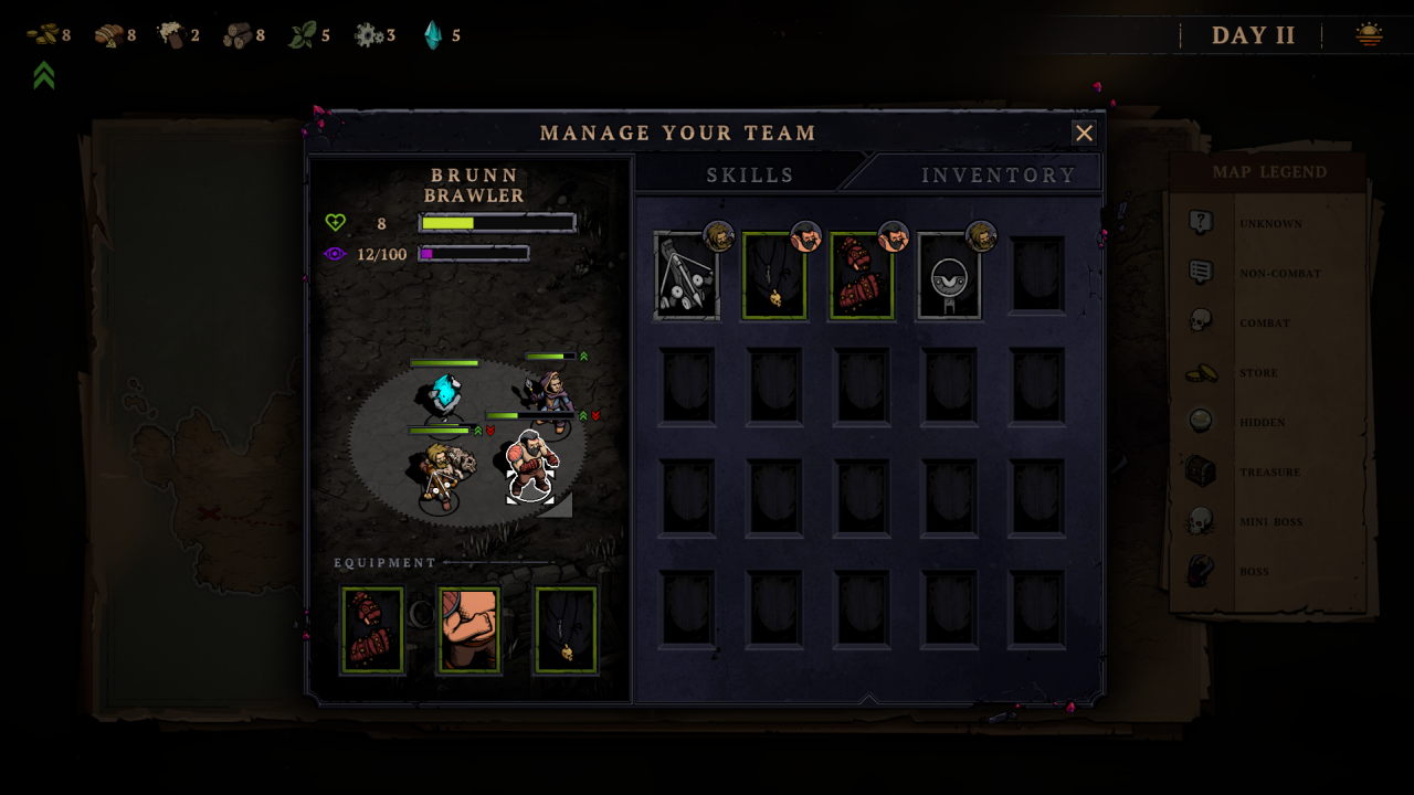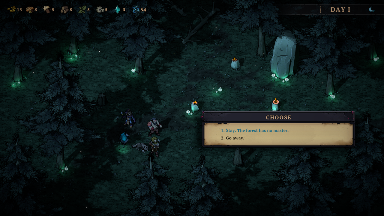 Zacznijmy jednak od podstaw – bazowo dostajemy w swoje ręce trzy archetypy postaci. Mag, łotrzyk i barbarzyńca. Każdy ma swoje mocne i słabe strony, a kolejnych śmiałków musimy odblokować odnajdując ich na mapie w trakcie podróży – związani z jakimś zadaniem. Skrupulatnie dobrane trio będzie naszym oddziałem w obrębie jednego runa, który przedziera się przez pola walki, wydarzeń i obligatoryjny obóz, do którego przysiądziemy raz na kilka dni. Obóz budzi nieśmiałe skojarzenia z Darkest Dungeon, gdzie dostajemy zestaw akcji, które są dostępne, jeśli zebraliśmy odpowiednie zasoby (drewno, piwo itp. – są to nagrody po każdej walce). To tam możemy podreperować zdrowie delikwenta lub zadbać o jego formę psychiczną. Im dalej zajdziemy w naszej próbie, tym większy obłęd im grozi. Musimy dbać przede wszystkim o światło (drewno wrzucane do ogniska), które ich uspokoi.