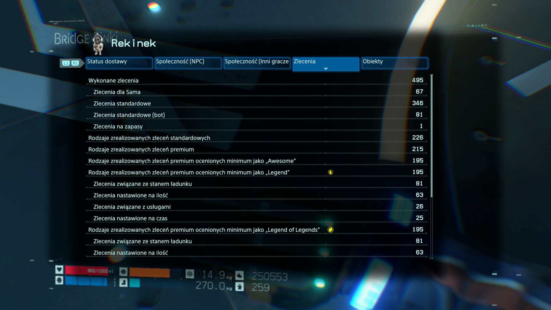 Ukończ co najmniej 10 różnych dostaw premium w każdej kategorii zlecenia z oceną „Legend” lub „Legend of Legends”. / Complete at least 10 unique premium deliveries in each order category with an evaluation of "Legend" or "Legend of Legends."