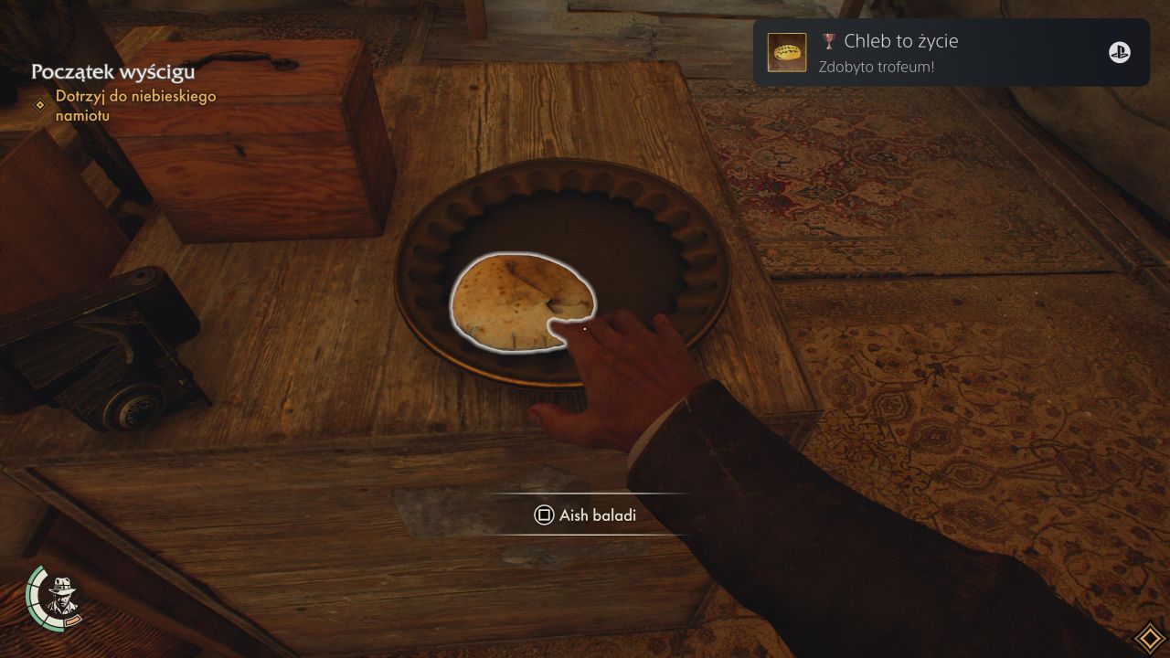 Pucharek związany z posiłkiem. W grze natkniemy się okazjonalnie na różne przekąski poprawiające tymczasowo nasze statystyki. Chleb aish baladi będziemy mogli znaleźć w regionie Gizy i wygląda jak na poniższym screenie. Możemy je znaleźć w różnych obozach w tym regionie. Wystarczy zjeść jeden chleb.