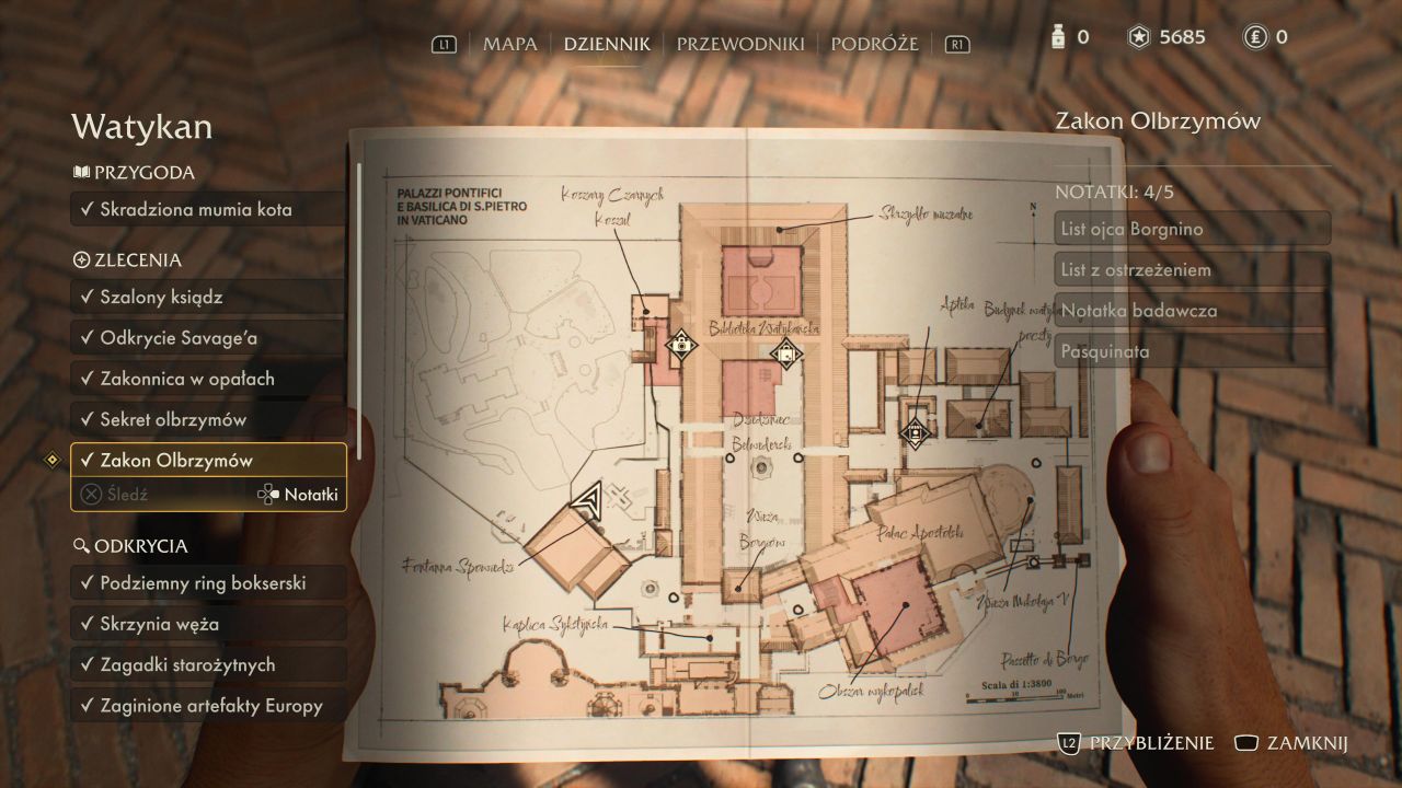 Ostateczny pucharek związany ze znajdźkami z dodatku wymagający zdobycia wszystkich wpisów do dziennika. Liczą się do tego wszelkie notatki, zdjęcia oraz zbierane artefakty. Łącznie mamy 118 wpisów do dziennika. Co istotne kilka z wpisów jest do odnalezienia na terenie Watykanu. Musimy zaznaczyć sobie tam zadanie Zakon Olbrzymów i zebrać wszystkie dotyczące jego notatki i zdjęcia. Mi właśnie jedna fotka została tam na koniec.