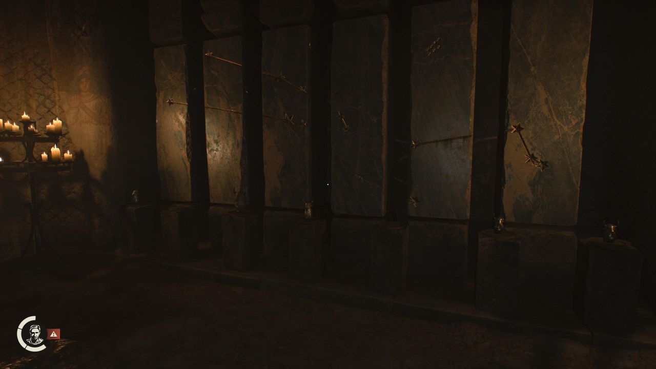 - Artefakt nymphusa – znajdziemy w główniej krypcie tytułowego zakonu w pobocznym pomieszczeniu, gdzie modli się dwóch kultystów. Musimy podejść do paszczy lwa i wcisnąć przycisk interakcji mimo, że nic się na ekranie nie pojawi. To otworzy nam przejście do zagadki. Tam musimy odpowiednio ułożyć posążki byków. Rozwiązanie pokazane jest na pierwszym z poniższych screenów z czego znaczenie ma wielkość posążków. Od lewej: średni, ciężki, średni, lekki, lekki.