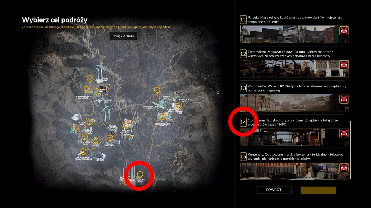 - Drewno – kontenery oraz znaki zapytania na mapie, gdzie sporo przedmiotów znajduje się w skrzynkach, z których pozyskacie drewno. Pamiętajcie, że meble do renowacji również możecie oddawać na Giełdzie Złomu (numer 4 na mapie).