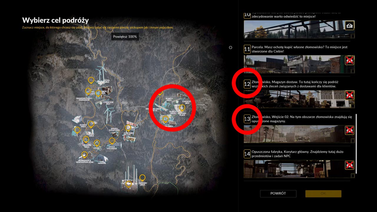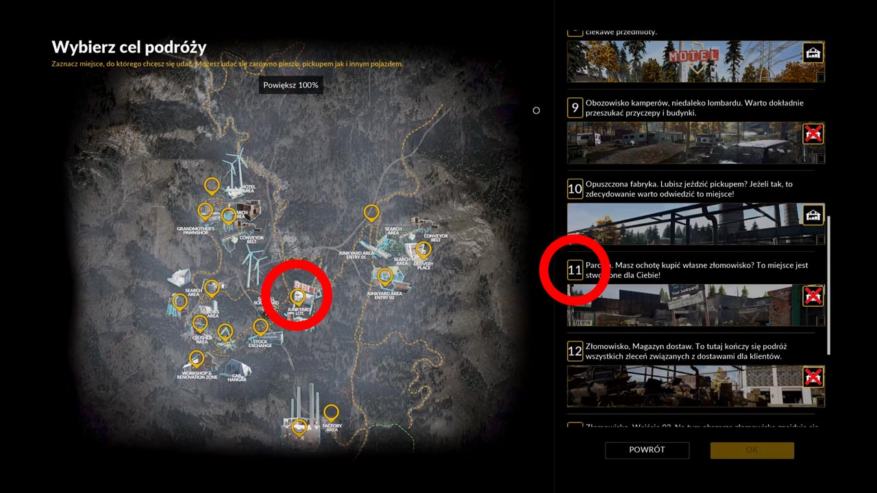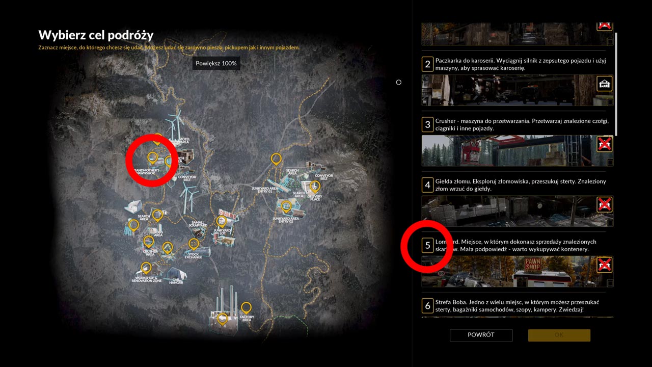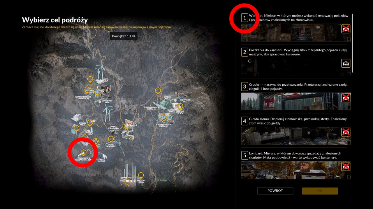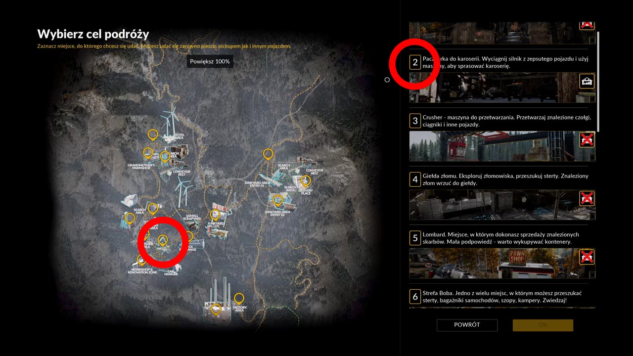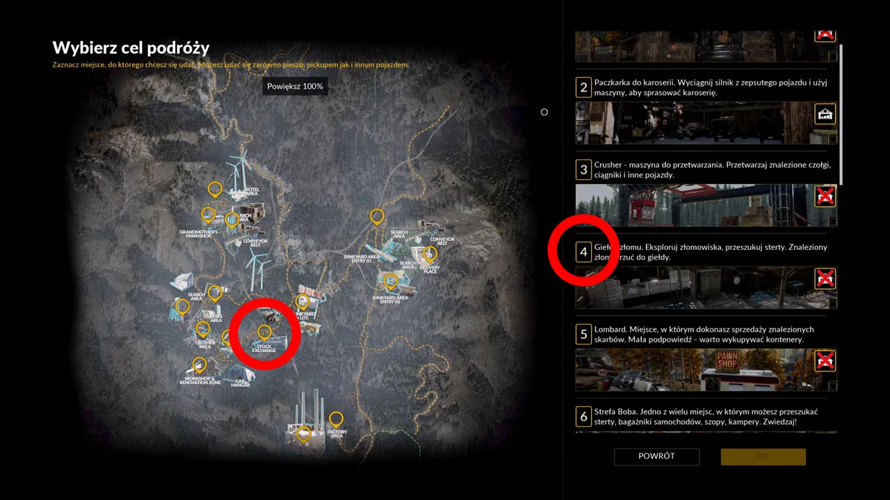 - Makulatura – odwiedzajcie znaki zapytania na mapie, po najechaniu kursorem na każdy z nich, pokaże się Wam informacja co można tam znaleźć. Załadujcie wszystko na pojazdy, a następnie wrzućcie do klatki przy Giełdzie Złomu (numer 4 na mapie).