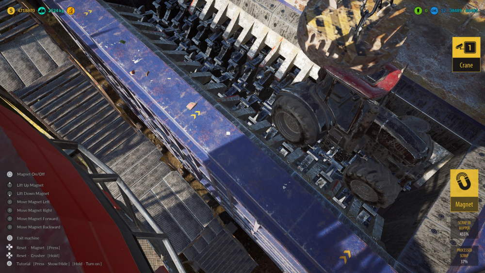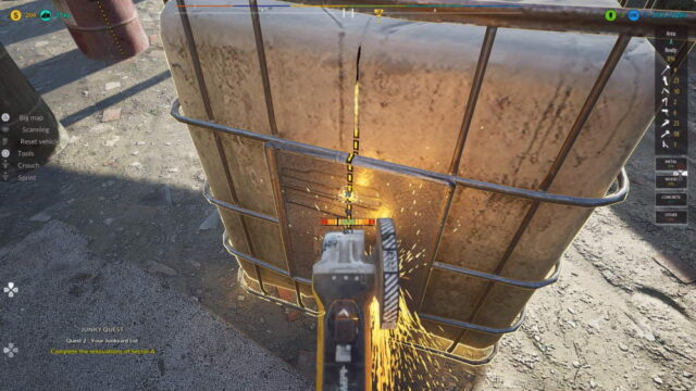 Zaczynamy na samym dole drabinki „złomiarstwa”, gdzie w ramach kolejnych zadań, będziemy poznawać mechaniki jakimi rządzi się gra. Początkowo zaciągniemy kredyt i kupimy własne złomowisko, które trzeba będzie uprzątnąć oraz odpowiednio rozwinąć, aby zaczęło przynosić profity. Będziemy ciąć beczki, palety, malować ściany, naprawiać usterki, aby w końcu móc zacząć poważnie inwestować w zakupiony grunt. W zależności od miejsca, będziemy mogli zakupić segregator złomu, warsztat czy chociażby serwis narzędzi. Nie będziemy musieli tego wszystkie sami obsługiwać, jako że możemy wynająć pracowników do tego, przydzielić im odpowiednią pensję czy czas pracy, a potem już tylko spijać śmietankę i cieszyć się hajsem. Samo złomowisko to tylko jeden element mechaniki jakie oferuje gra, ale zdecydowanie najciekawszy. Innym jest obsługa małej kruszarki, gdzie będziemy mogli zmielić wraki pojazdów w metalową kostkę, z której pozyskamy cenne materiały. Podobna zasada panuje przy dużej kruszarce, tyle że tam przemiał już jest znacznie większy i możemy zmielić nawet czołg (nie żartuję). Wszelkie materiały można sprzedawać na giełdzie, w zależności od obecnego kursu. Czasami nie warto sprzedawać od razu wszystkiego, tylko poczekać aż będzie to bardziej opłacalne.