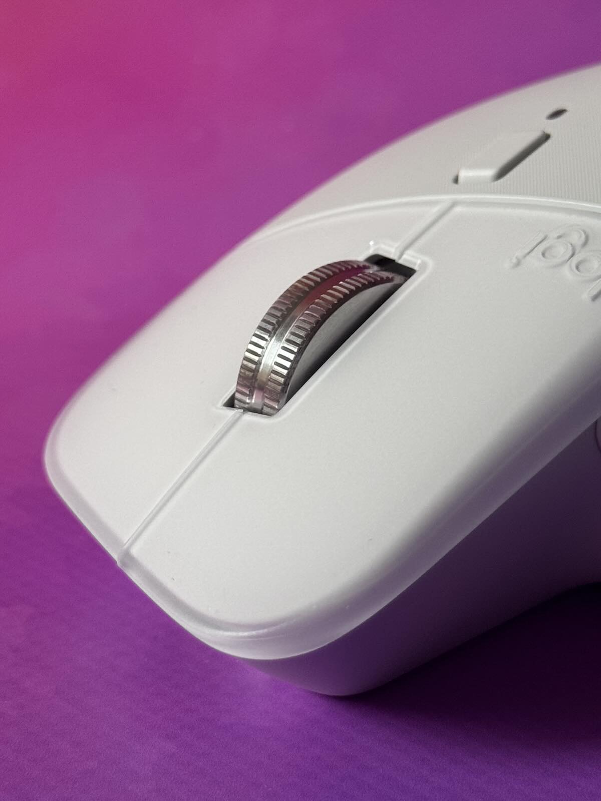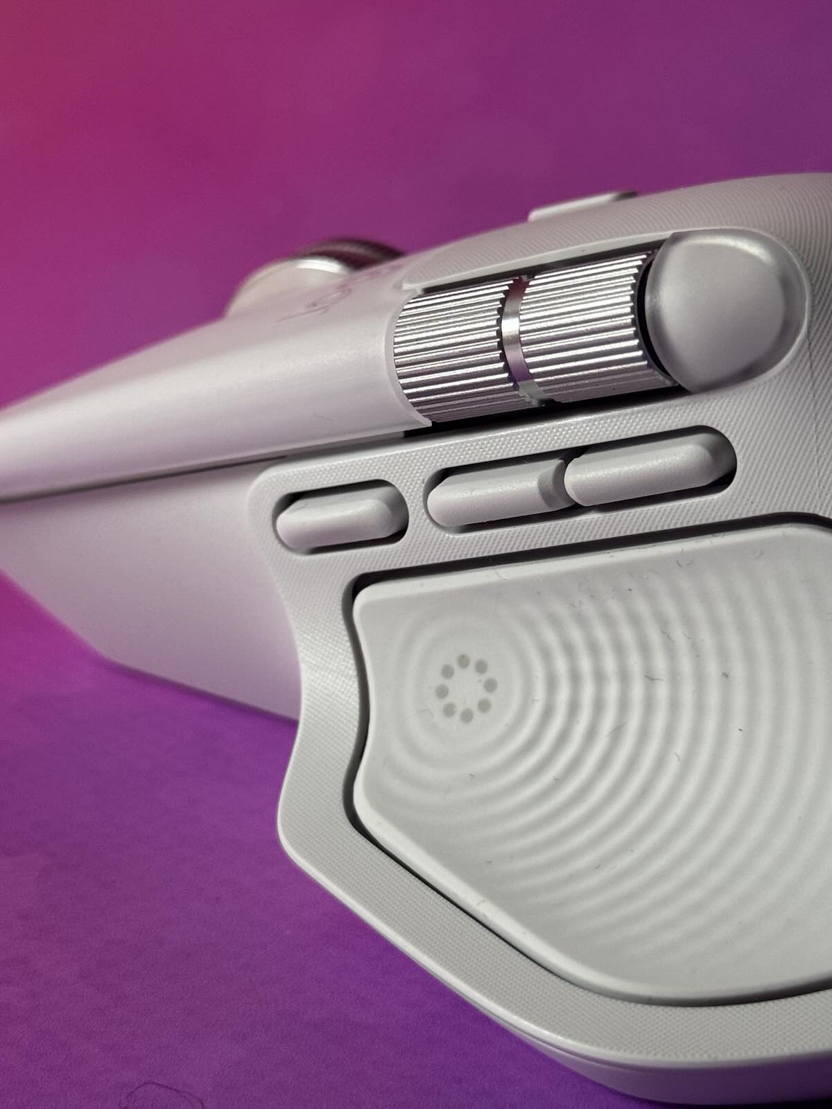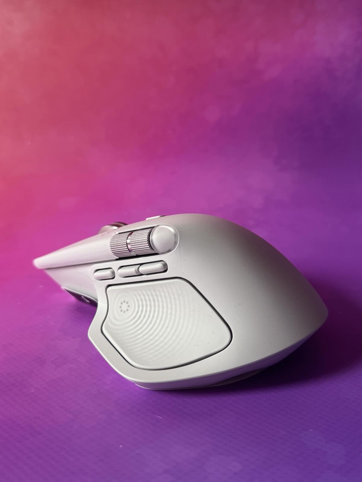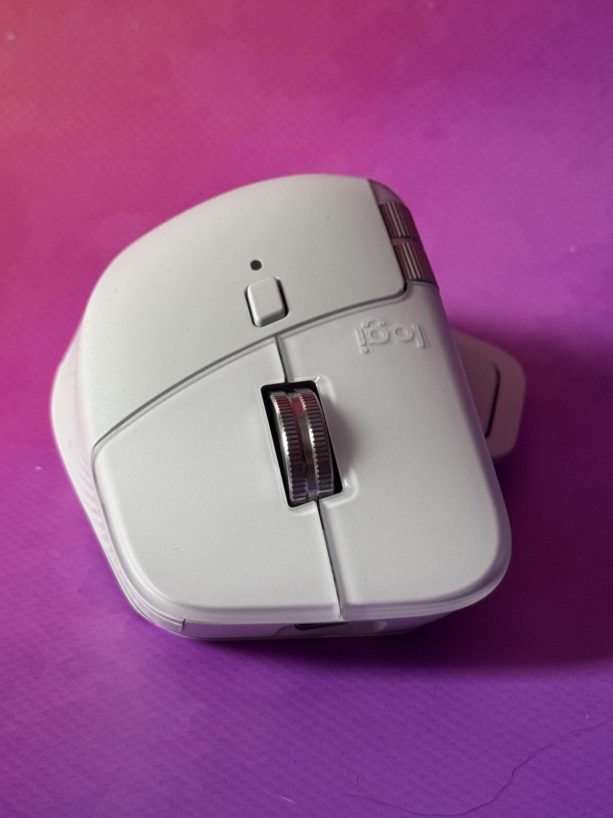 Materiał, z którego wykonano MX Master 4, również przeszedł poprawki. W porównaniu do MX Master 3 zastosowano powierzchnie, które są łatwiejsze w czyszczeniu i mniej podatne na ścieranie czy pozostawianie odcisków palców. Niestety powierzchnia mocno łapie kurz i wszelkiego rodzaju włosy (pozdrawiam stąd mojego psa i kota), więc na białej wersji jest widoczny każda jedna igiełka. Natomiast wrażenie solidności jest zauważalne od pierwszego chwytu. W miejscu pracy mam niestety zwykłą „zakładową mysz”, ale gdy wracam do domu to osobiście odczuwam różnicę już po kilku godzinach pracy – ręka mi się nie męczy, a przyciski boczne oraz rolka pod kciukiem są intuicyjnie rozmieszczone i łatwo dostępne, nawet jak dla mojej mniejszej dłoni.