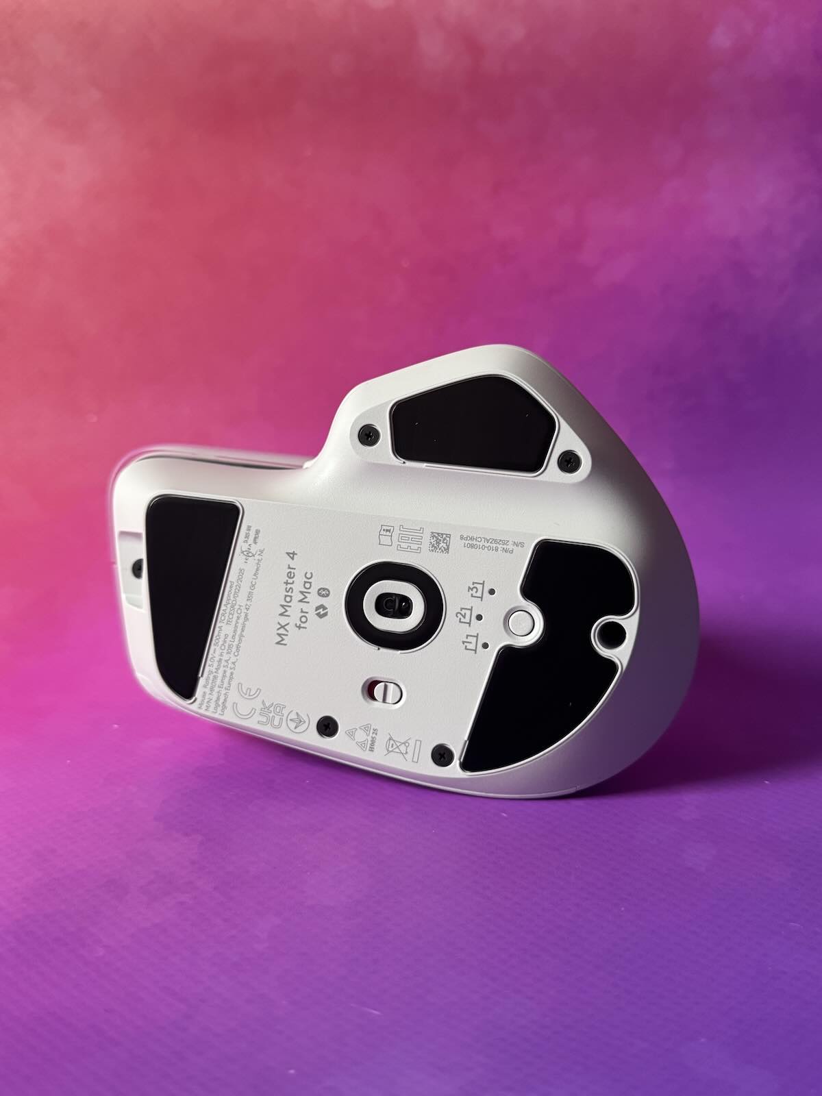 Specyfikacja techniczna MX Master 4 jak zawsze prezentuje się imponująco. Mysz nadal korzysta z wysokiej klasy sensora o rozdzielczości 8000 DPI, co zapewnia precyzyjne i płynne śledzenie ruchu na różnych powierzchniach, w tym na szkle i matowych biurkach, a nawet na zwykłej pościeli :). Rolka MagSpeed, znana z poprzednich modeli, pozostaje jednym z największych atutów tej myszy. Pozwala na szybkie przewijanie dużych dokumentów lub stron internetowych w trybie swobodnym, a jednocześnie oferuje precyzyjny tryb krokowy, który sprawdza się w pracy z edytorami graficznymi i arkuszami kalkulacyjnymi. Bateria o deklarowanej żywotności według producenta około 70 dni (u mnie na razie miesiąc bez ładowania – spadek baterii z 80% do 20%) w praktyce nie spisuje się aż tak dobrze, a ogólnie szybki charging odbywa się wygodnie przez port USB-C, co eliminuje problem ciągłej wymiany baterii. Warto zaznaczyć, że wersja „For Mac” nie posiada odbiornika bluetooth!
