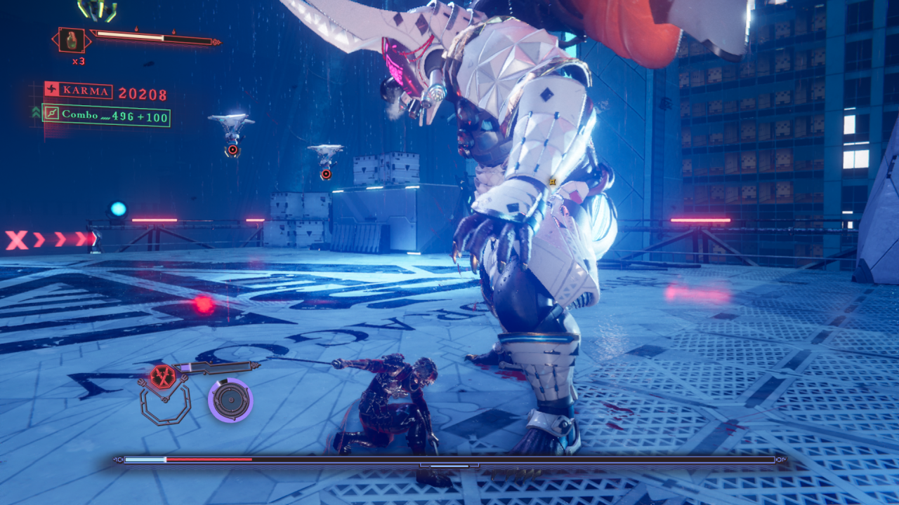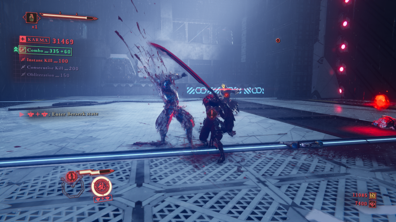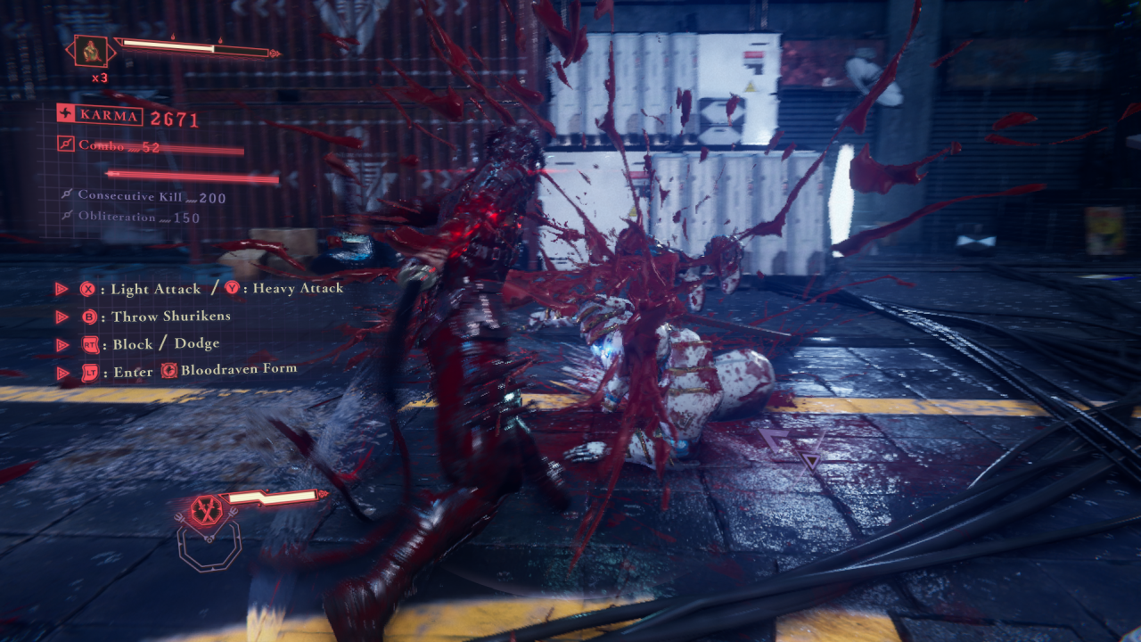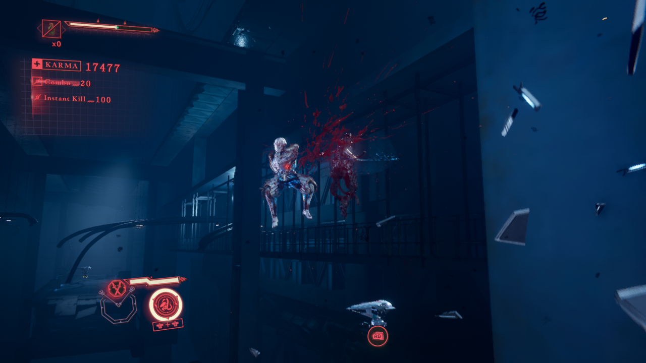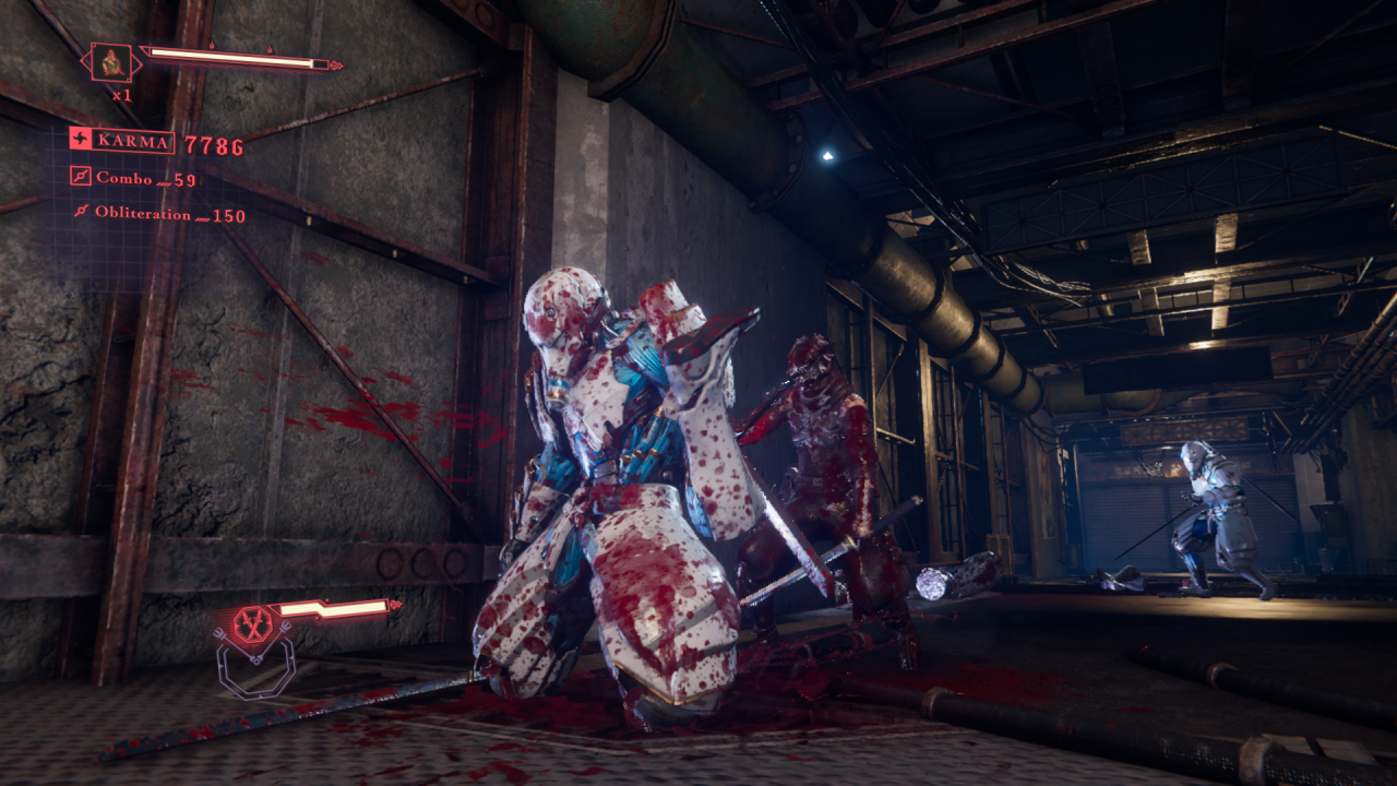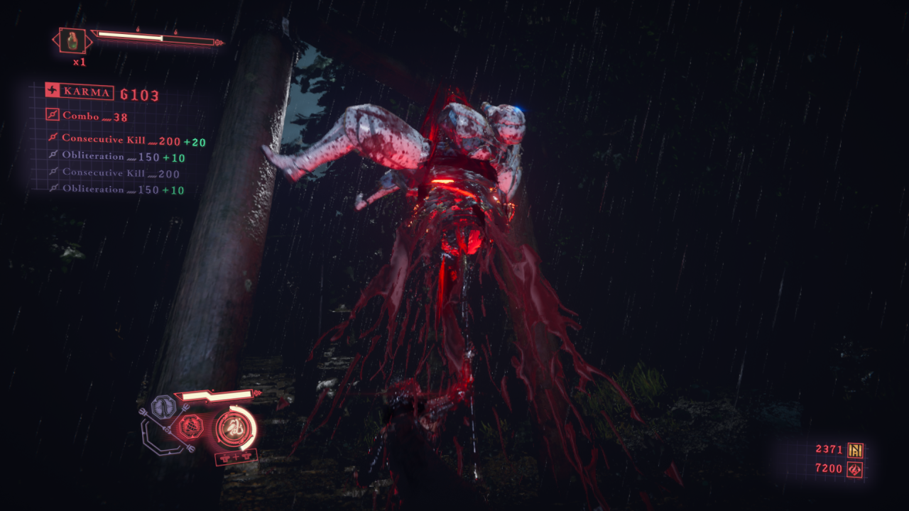 Nie odkryję Ameryki, pisząc, że masz do dyspozycji lekki i mocny atak, shurikeny, których słabość na niewiele Ci się zda oraz blok połączony z możliwością dodge’owania. To ostatnie zostało zgrabnie wbudowane w dynamikę i tylko na pierwszych metrach doprowadza do delikatnego zgrzytu. Sam przycisk oznacza blokowanie, przy odpowiednim timingu (i posiadanych skillach) również parowanie z kontrą, a gdy wychylimy analog, to nasz ninja wykona unik. Technika o tyle skuteczna, że schodzi całkowicie z linii ciosu i poprawia naszą pozycję. Wszystko działa intuicyjnie, a na responsywność nie można narzekać – bo jakby było można, to jakikolwiek slasher byłby do śmieci! Ekranowy efekt naszych rosnących umiejętności to czysta poezja. Esencja slasherowej brutalności i nieprzerwany uśmiech na ustach.