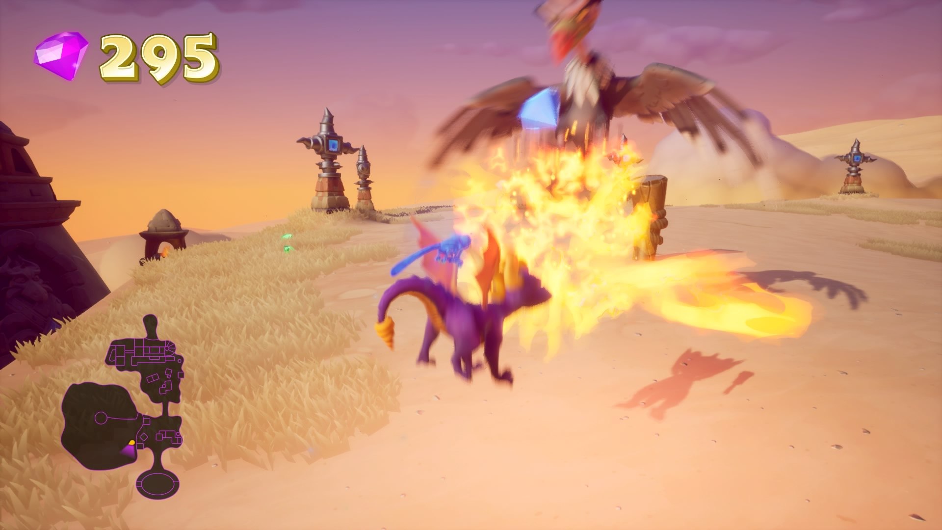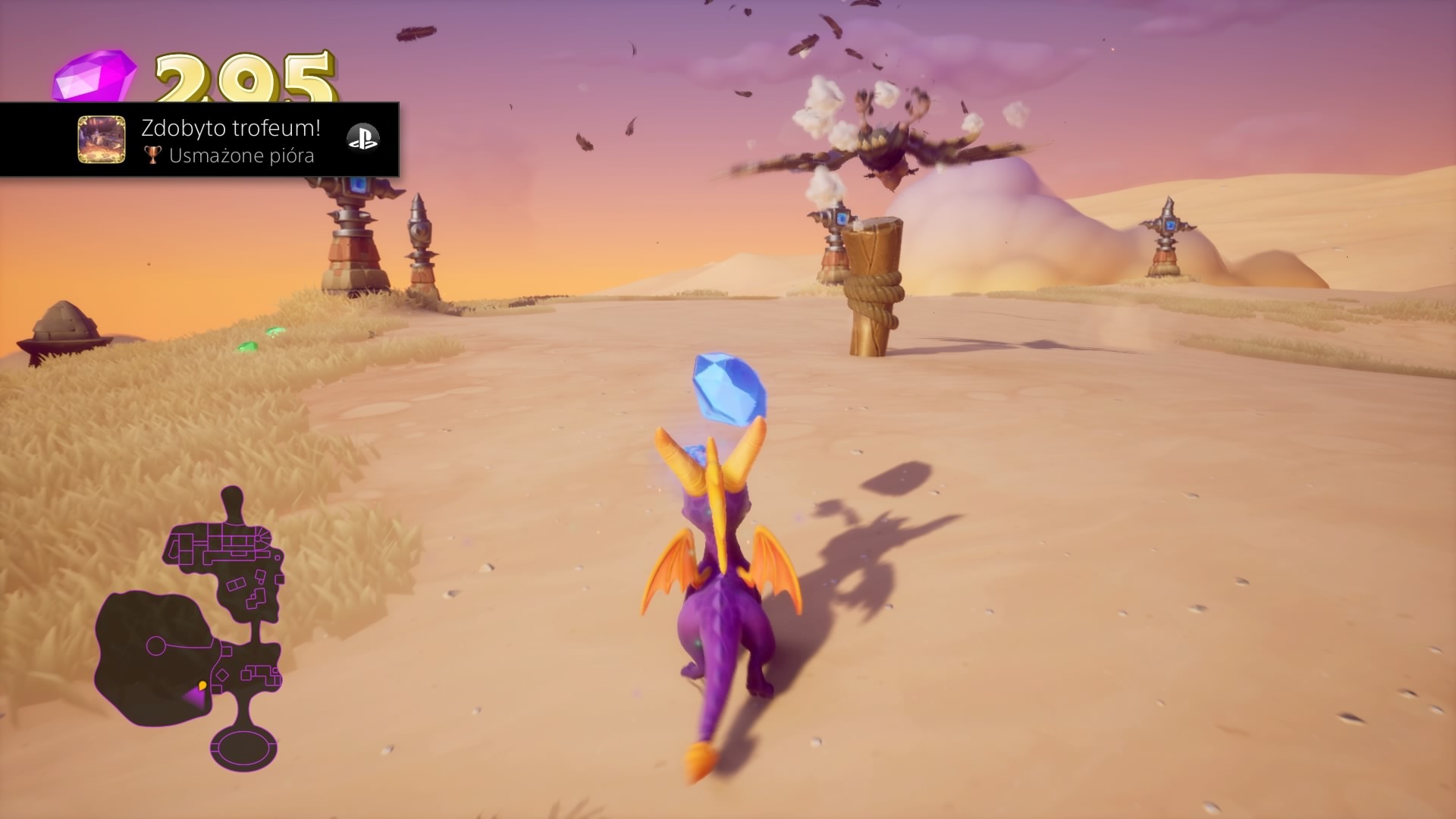 Po zebraniu 100% wszystkiego w grze, otworzy się ostatni etap (Gnasty’s Loot), w którym do zebrania jest aż 2000 gemów. Etap jest dość specyficzny, bowiem jest etap latany, ale bez limitu czasowego i z normalnymi gemami zamiast zbierania zestawów. Na początku jesteśmy też ograniczeni maksymalna wysokością lotu – nie możemy lecieć wyżej, niż spyro jest w stanie wejść bez machania skrzydłami. Aby odblokować kolejną maksymalną wysokość, należy znaleźć złodzieja z kluczem i otworzyć drzwi, które pozwolą nam wejść wyżej. Zebranie 2000 klejnotów nie powinno być problemem, wymaga jedynie czasu. W ostatniej komnacie jest ukryte jest około 1000 gemów, więc zakończenie przygody ze Spyro zostanie hucznie uczczone. Jeśli nie przegapisz żadnego trofeum w trakcie gry, powinna wyskoczyć w tym momencie platyna.