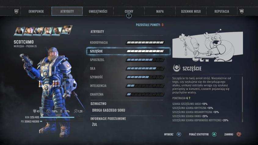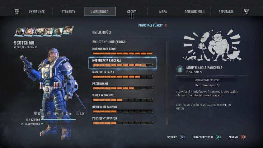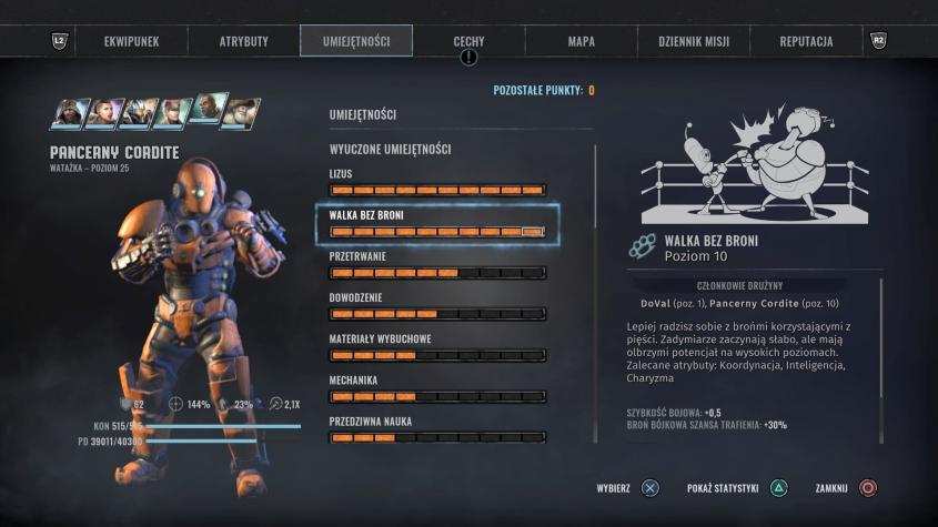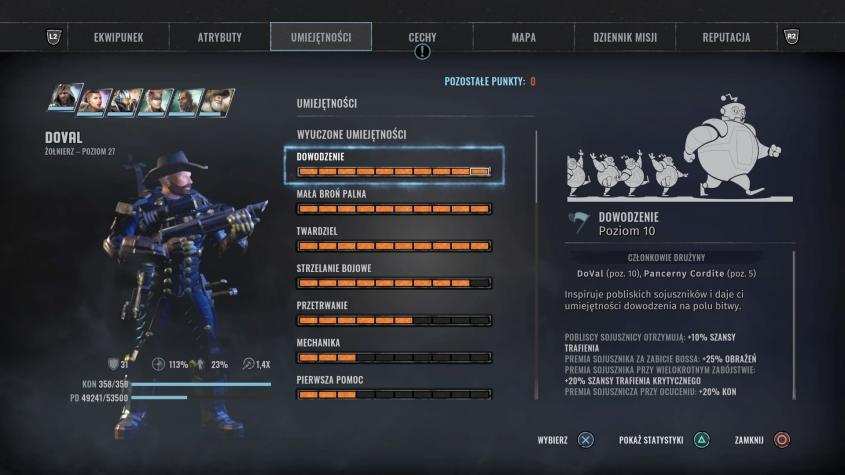 - Lizus, Twardziel, Dowodzenie – głównie dla wymaganych opcji dialogowych, dowodzenie podnosi statystyki zespołu,